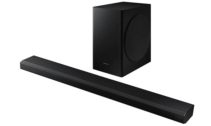 מקרן קול אלחוטי ואיכותי מבית Samsung בעל 3.1.2 ערוצים עם אופציות קישוריות רבות: Bluetooth ו-HDMI ותמיכה בצליל היקפי תלת מימדי ובסראונד וירטואלי, כולל סאבוופר אלחוטי.